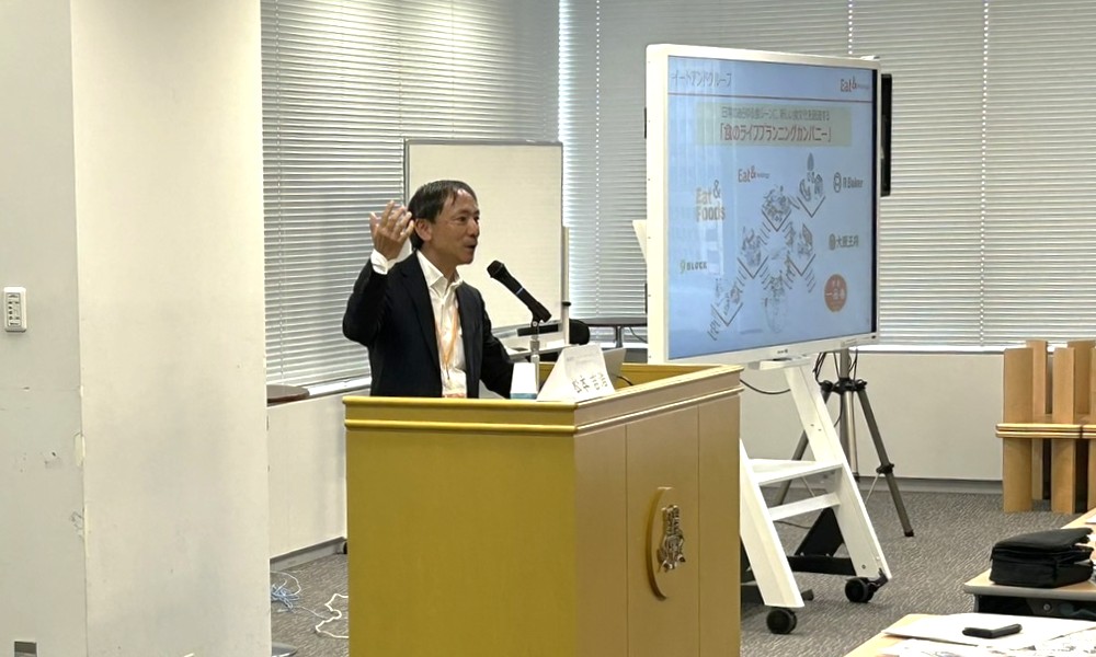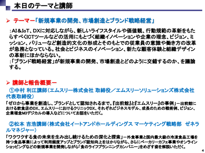 松本講師からは、「外食事業」と「食品事業」の両輪で安定した成長を続けているイートアンドホールディングスの深化と探索の試み、一人のリーダーの誕生がもたらした変革からフィロソフィーの重要性などに関するお話を頂きました。