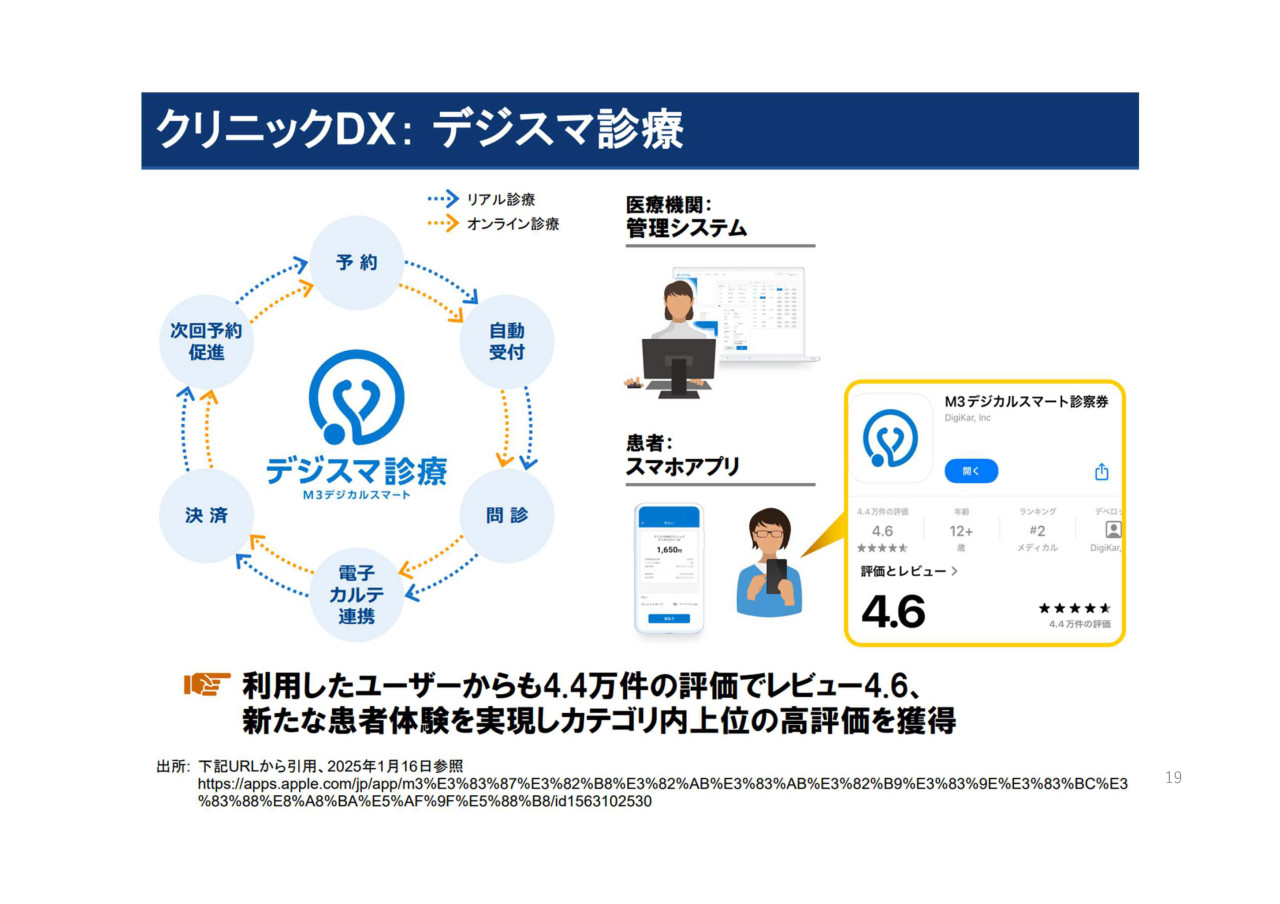 また「B to B to C」向けの取り組みである、電子カルテを取り入れた「デジスマ診療」は、お客様である患者の方々から、クレジットカードでの会計、保険証も毎月出さなくていいから助かるなど、高い評価を獲得しています(Appleのアプリ・ストア評価で4.6。メディカルの分野では1位を獲得)。しかし特に宣伝はしておらず、SNS等の口コミで広がっています。