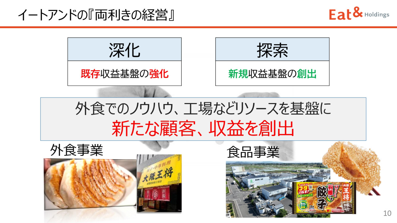 また食品事業が安定した収益基盤となったことを受けて、今度は外食・食品事業の両輪を持つ企業として「深化」をしていく必要があります。西日本エリアの新しい生産拠点となる九州工場の建設や新しい餃子開発など、餃子そのものをより盛り上げていく「深化」が重要です。ここには一切手を抜きません。