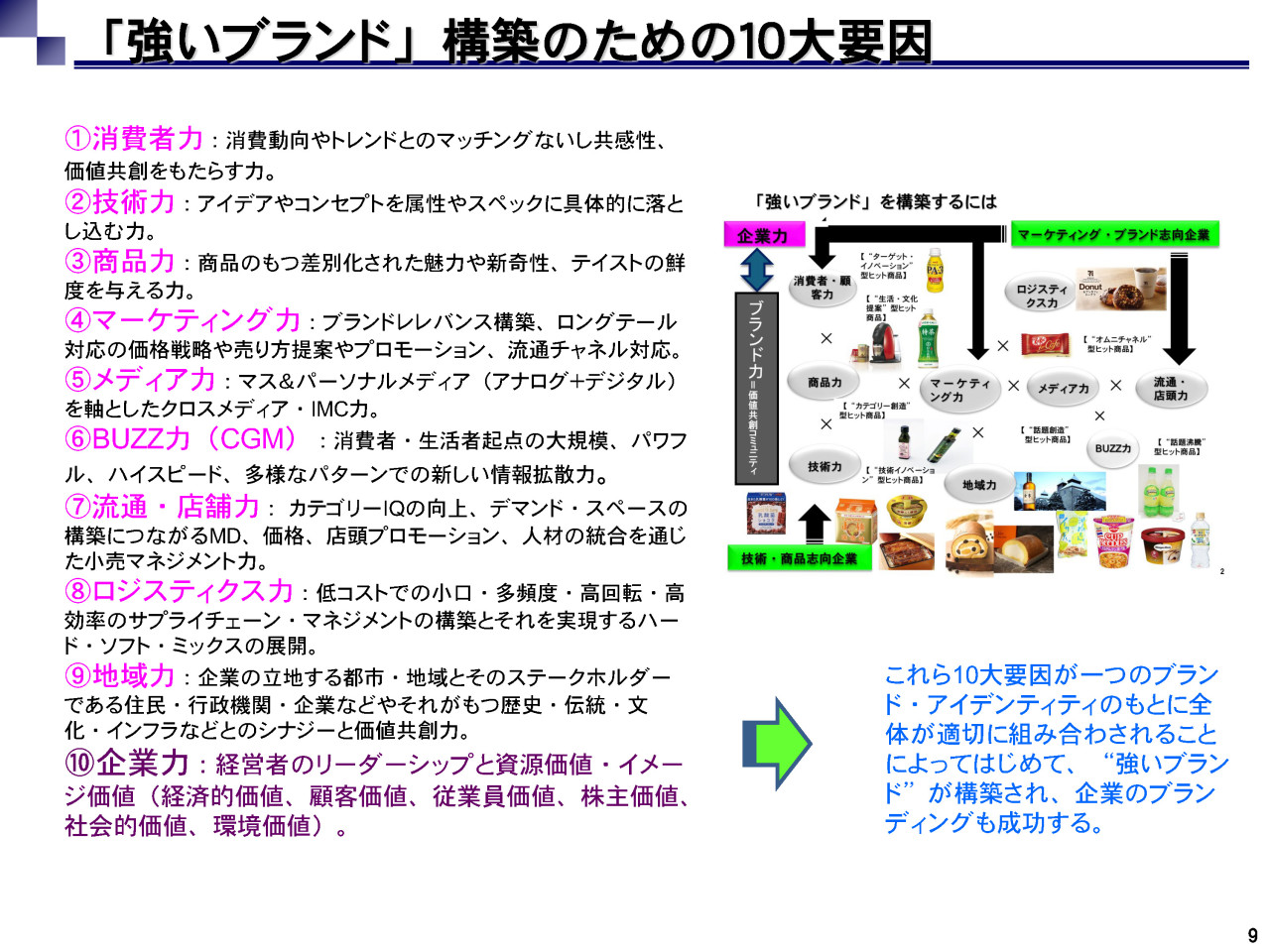 陶山理事長:「強いブランド」を構築するための10大要因には、①消費者力、②技術力、③商品力、④マーケティング力、⑤メディア力、⑥BUZZ力、⑦流通・店舗力、⑧ロジスティクス力、⑨地域力、そして⑩企業力(経営者のリーダーシップやイメージ価値)があります。