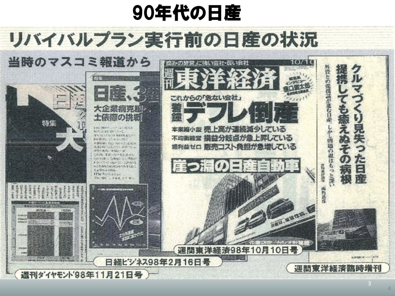 志賀講師:1990年代の日産は、極めて深刻な危機にありました。当時のメディアの報道を見ると、「クルマづくり見失った日産」「デフレ倒産予備軍の自動車」といった厳しい言葉が並び、まさに経営の危機に瀕していたことがわかります。