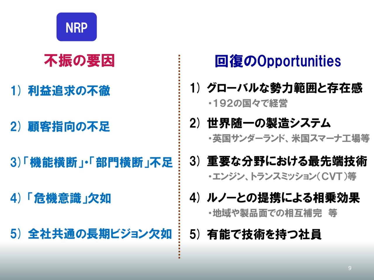 志賀講師:一方で、日産には回復の機会(オポチュニティ)もあると強調しました。世界192カ国でのグローバルな勢力範囲、英国サンダーランドや米国スマーナ工場などの世界随一の製造システム、エンジンやCVTといった最先端技術、ルノーとの提携による相乗効果、そして有能で技術を持つ社員の存在です。
