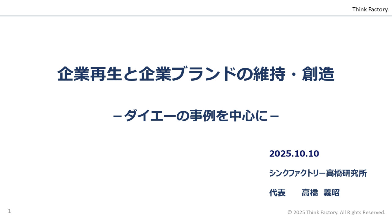 高橋講師:シンクファクトリー高橋研究所代表の高橋義昭でございます。本日は「企業再生と企業ブランドの維持・創造」というテーマで、私が長年在籍し、経営再建に身を置いたスーパーのダイエーの事例を中心に、その経験から得られた教訓をお話しさせていただきます。