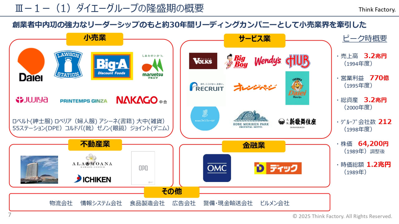 高橋講師:ダイエーグループは、1990年代前半のピーク時には小売業を軸とし、サービス業、不動産業、金融業などを展開し、グループ会社数は212社(1998年度)、売上高は3.2兆円(1994年度)に達していました。時価総額も1989年には1.2兆円に達し、日本を代表する巨大企業でありました。