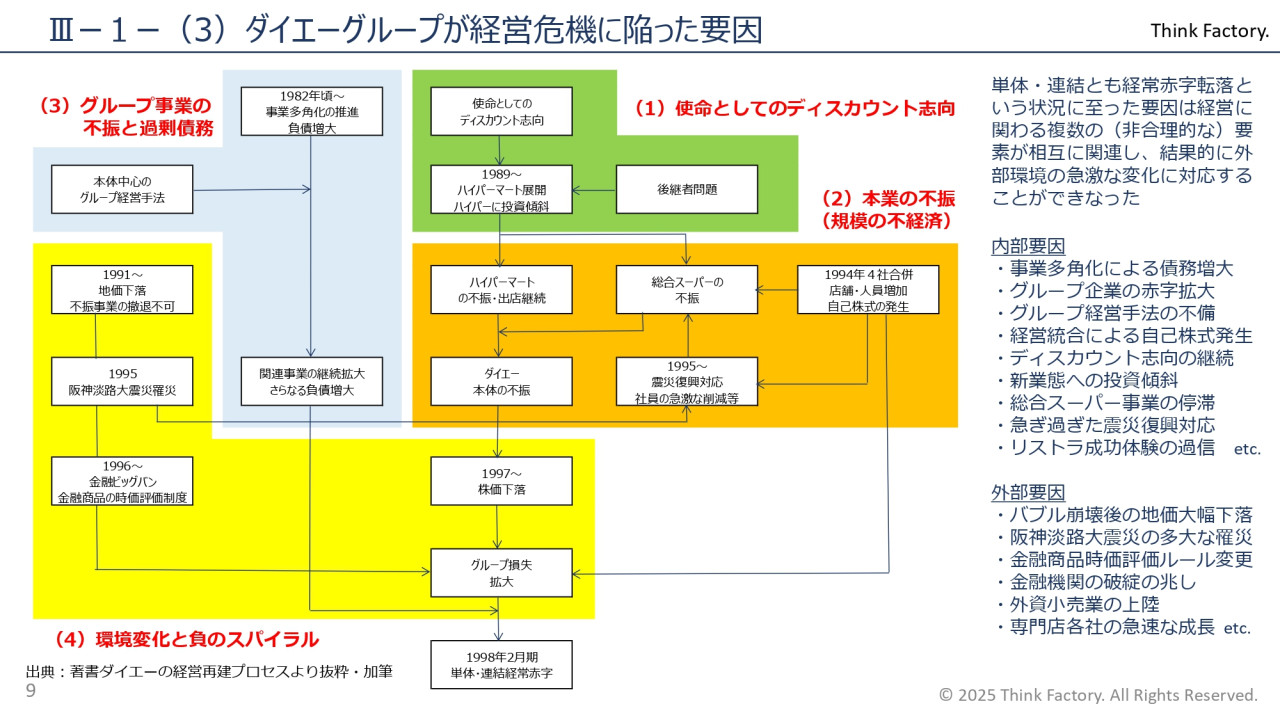 自主再建の期間は、打ち手の選択肢が最も潤沢である段階であります。しかし、ダイエーは、この重要な分岐点で「企業という箱を救うのか、小売事業を再生させるのか」という真剣な議論を欠いたまま、祖業への執着から脱却できませんでした。