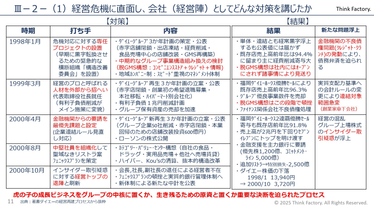 これは、成長ビジネスに軸足を移すという重要な事業構造改革の選択肢でありましたが、創業者が作り上げた祖業(総合スーパー)への思い入れや、過去のリストラ成功体験への過信などから、日の目を見ることなく見送られました。