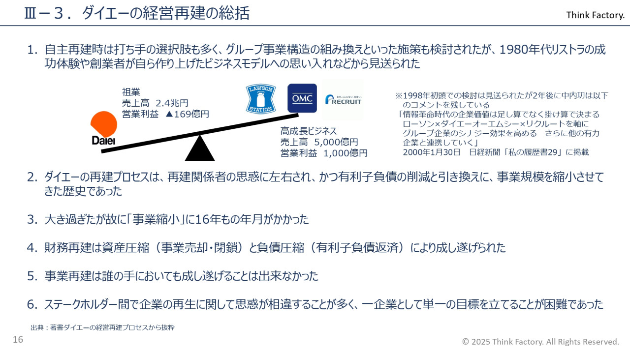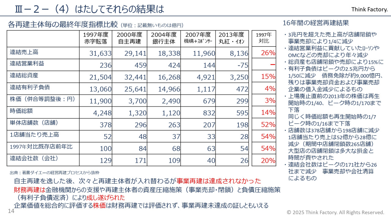 高橋講師:結果として、ダイエーは16年という長い期間を費やし、約9,000億円の債務免除と、優良子会社や資産の売却により、有利子負債をピーク時の約1/50まで減らし、財務再建は達成されました。