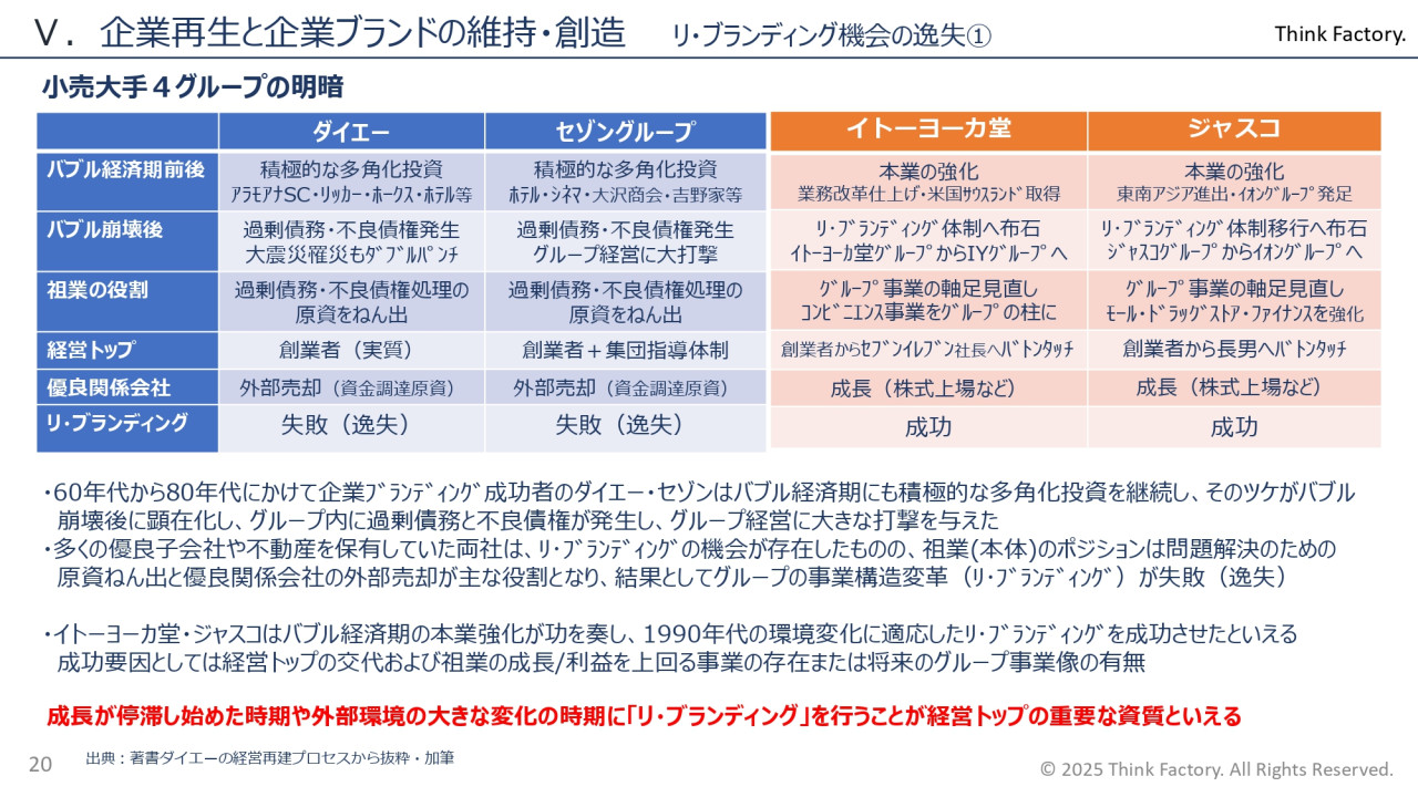 バブル崩壊前後に、イトーヨーカ堂(セブン&アイHDへ移行)やジャスコ(イオンへ移行)は、創業者が交代したか、あるいはその成長性が祖業の成長を上回る事業をグループの柱に据えることで、グループの軸足を創業の祖業から変化させ、リ・ブランディングに成功しました。